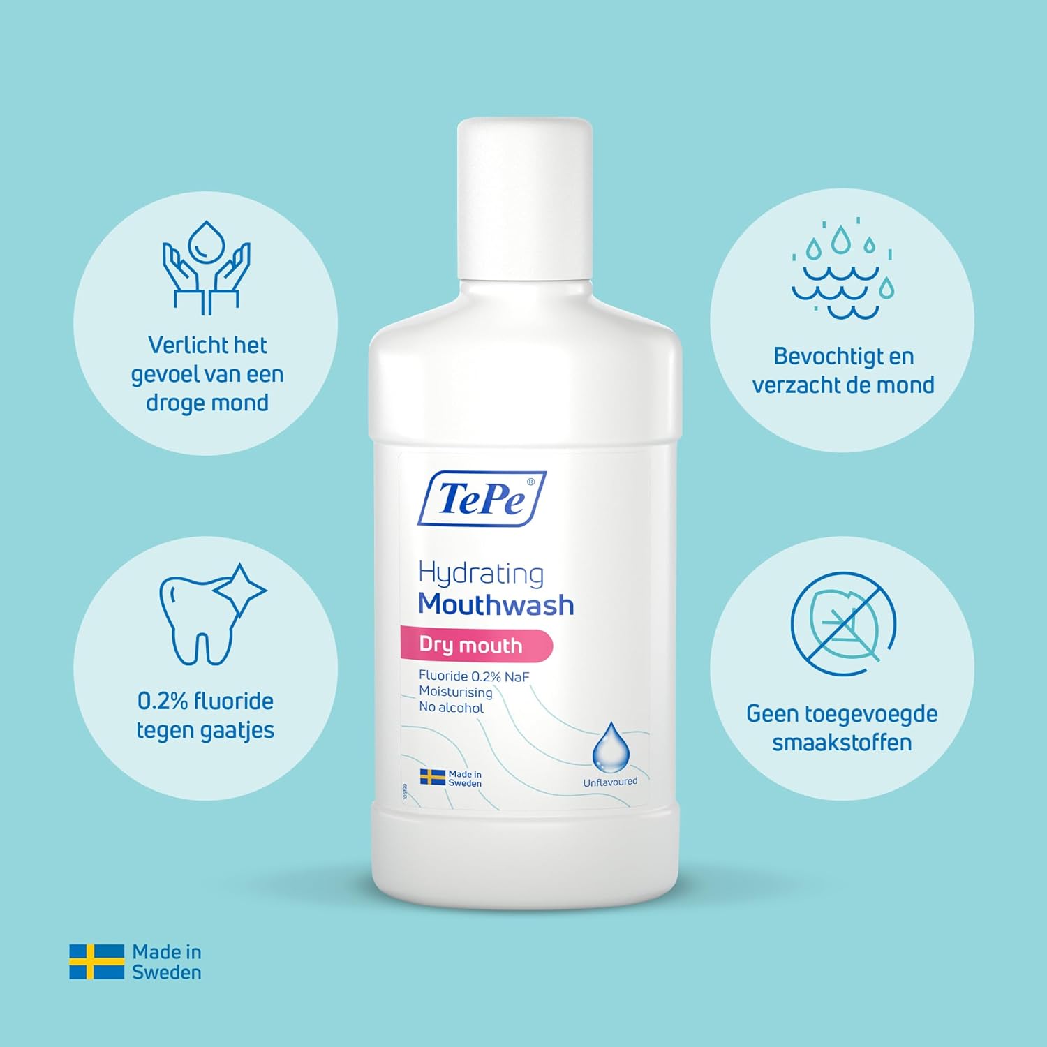 TePe Hydraterende Mondspoeling voor droge mond, helpt het gevoel van een droge mond te verlichten. De stroperige textuur bevochtigt en verzacht de mond en zorgt voor een aangenaam gevoel na gebruik. De milde formule bevat geen alcohol en geen toegevoegde smaakstoffen. Speeksel helpt de mond te reinigen van bacteriën, waardoor tandplak zich niet op en rond de tanden kan ophopen. Met minder speeksel worden de tanden kwetsbaarder voor cariës en de zachte weefsels gevoeliger en vatbaarder voor infecties. TePe Hydraterende Mondspoeling bevat 0,2% natriumfluoride en wordt aanbevolen als fluorideaanvulling voor mensen die door hun droge en gevoelige mond een verhoogd risico hebben op cariës. TePe Hydraterende Mondspoeling is verkrijgbaar in een fles van 500 ml met een praktische beker om eenvoudig te kunnen doseren.
